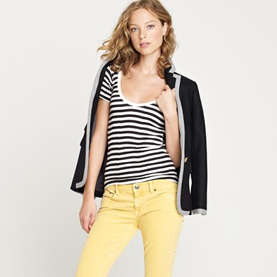 From JCrew: “Edith A. Miller is the result of some serious sartorial serendipity; founders Nancy Gibson and Jennifer Murray showed up to a summertime soirée wearing the same adored-but-impossible-to-find stripe tee. Bonded by their love of supersoft knits from little-known Pennsylvania menswear maker Robert P. Miller, they decided to approach the mill with a plan to make women’s clothes. One road trip (and a healthy dose of chutzpah) later, a sister line was born. Combining Gibson and Murray’s thinking-girl aesthetic with homegrown craftsmanship (the mill has been in the same family for six generations), we sense this might be the beginning of a latter-day American classic. Cotton. Scoopneck. Short sleeves. Import. Machine wash.”