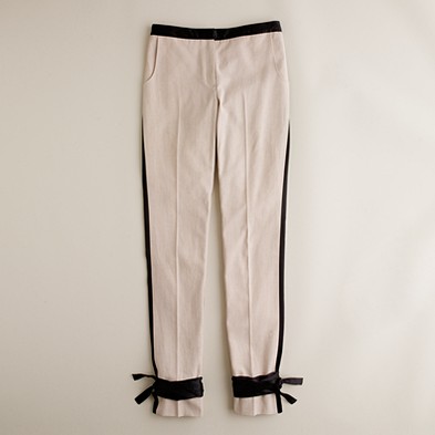 From JCrew: “Our covetable, limited-edition capsule collection from design darling (and CFDA/Vogue Fashion Fund prize runner-up) Prabal Gurung arrives just in time for summer—and you’ll only find it at J.Crew. The silk stripes on these tuxedo trousers turn into ankle ties—a detail Gurung says is inspired by the women he designs for: “There’s nothing sexier than a really intelligent girl with many layers to her…I think these pants have that same quality. There’s a story to tell.” There’s no right way to wear them or tie them, he says—just use your imagination. Cotton. Zip fly. On-seam pockets, back welt pockets. Import. Dry clean.