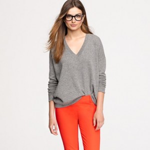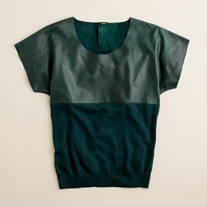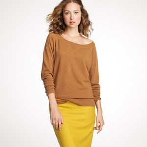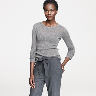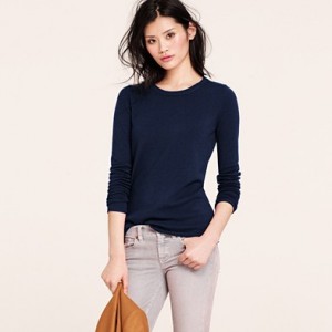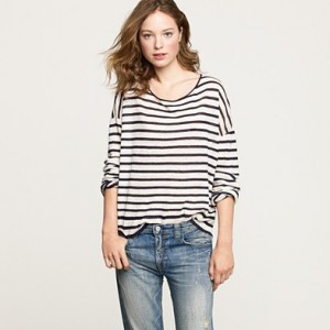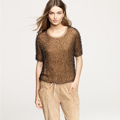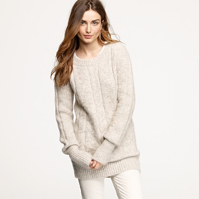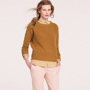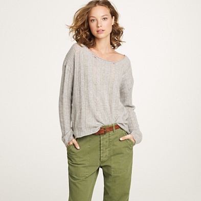 From JCrew: “Our classic crewneck sweater earns its stripes in a chunky knit accented with military-inspired detailing, like epaulets and leather buttons for a touch of tough-chic style. Merino wool in a 7-gauge knit. Three-quarter sleeves. Hits at hip. Import. Dry clean.”