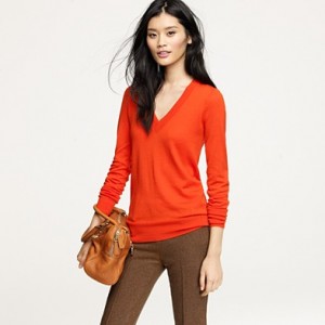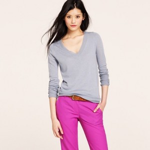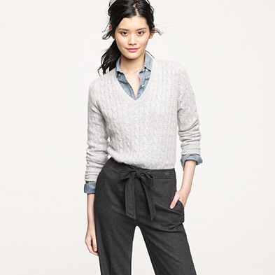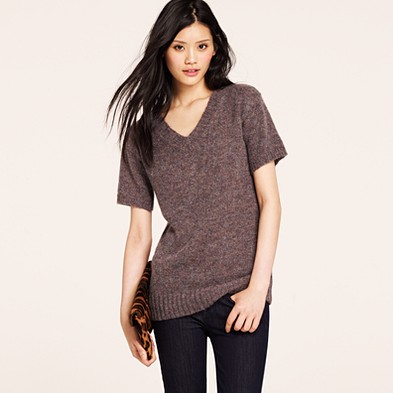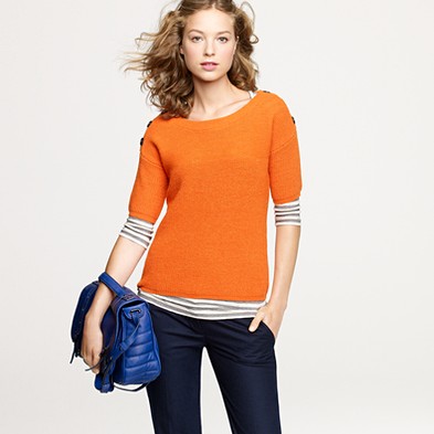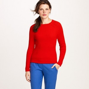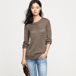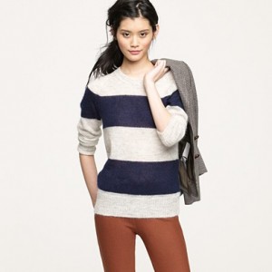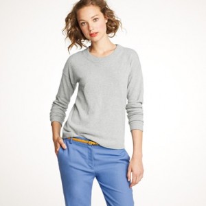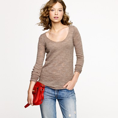 From JCrew: “A combo of thick and thin yarns were spun together to create the brilliant, lofty texture of our newest pullover. Fashioned with a scoopneck and a slightly relaxed silhouette finished with a shirttail hem, it’s the perfect transitional piece you’ll be wearing from the last days at the beach and well into fall. Acrylic/wool/mohair in a 7-gauge knit. Long sleeves. Hits below hip. Import. Dry clean. Catalog/jcrew.com only.”
