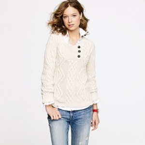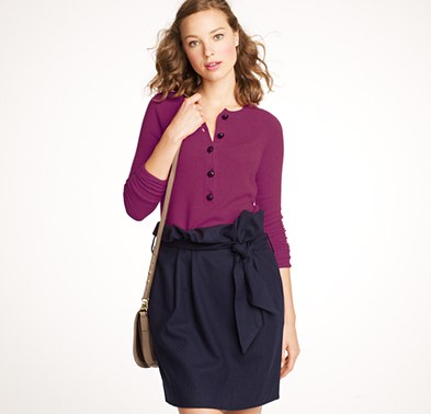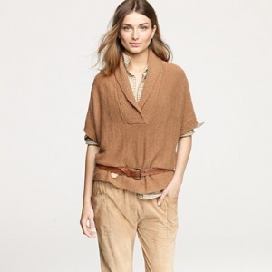 From JCrew: “Our drapey and highly beltable cropped sweater features a feminine, face-framing shawl collar and oversize short sleeves. Fashioned from alpaca with a touch of fine-gauge merino for softness, it’s the perfect piece for work or play. Acrylic/alpaca/merino wool in a 7-gauge knit. Hits at hip. Import. Dry clean.”