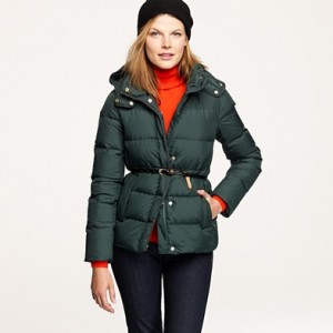 From JCrew: “Our latest light-as-air puffer that’s completely compact and easy to layer yet warm enough to keep winter’s chill at bay. We glamorized the sporty shape with a slimmer silhouette, gold snaps and a waist-cinching belt for a dose of downtown cool. Down-filled poly. Point collar. Snap closure. Long sleeves. Patch pockets. Functional snaps at cuffs. Hits below hip. Import. Machine wash.”