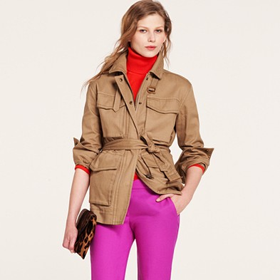 From JCrew: “Our fresh-for-fall update to the utility jacket—a cool, go-anywhere classic in crisp cotton with burnished brass hardware and a chic standing collar—guaranteed to command attention. Snap closure with hidden zipper. Long sleeves. Patch pockets. Hits at hip. Import. Machine wash.”