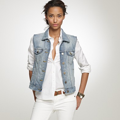From JCrew: “We love throwing a beat-up denim vest over sweet sundresses and skirts—a fresh summer mix of flirty and tough. Cotton. Standing collar. Back tabs at waist. Chest patch pockets with flaps, vertical welt pockets. Hits at waist. Import. Machine wash. Catalog/jcrew.com only.”