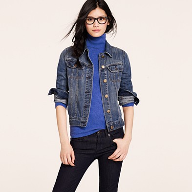 From JCrew: “Everything you loved about our best-selling Nolita jacket, now updated with a cool new darker wash. Perfectly distressed and weathered to look and feel as if you’ve been wearing it for years. Cotton. Point collar. Long sleeves. Back belt. Slant chest flap pockets with button closure. Functional buttons at cuffs. Hits above hip. Import. Machine wash. The nature of this product may result in color transfer—we suggest laundering at home in your machine before wear. Available in select stores.”
