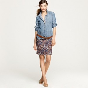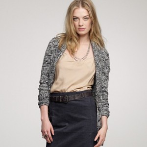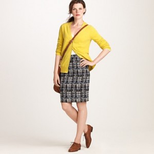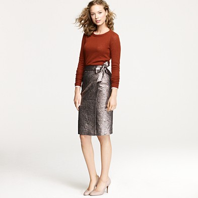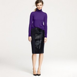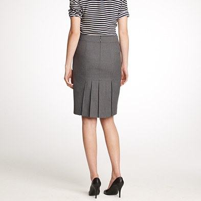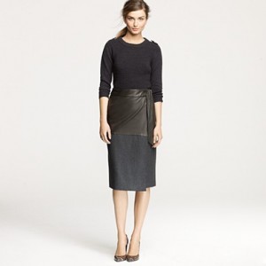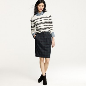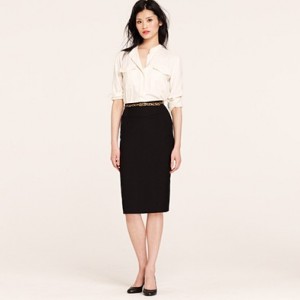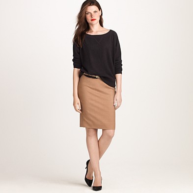 From JCrew: “A true design icon—the pencil skirt—meticulously shaped and seamed to figure-flattering perfection (say hello to mile-long legs). The double-serge wool lends the sleek silhouette a weightier feel that couldn’t be more perfect for colder days. With a thinner waistband for an even more comfortable fit. Sits at waist. Back zip. Back vents. Fully lined. 23 1/2″ long. Import. Dry clean.”