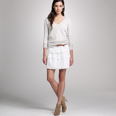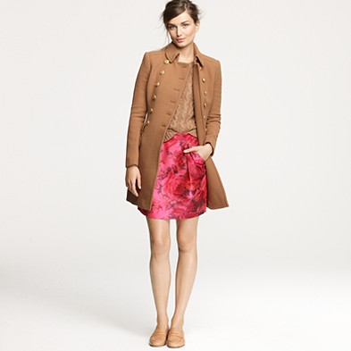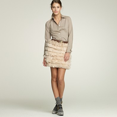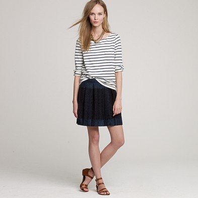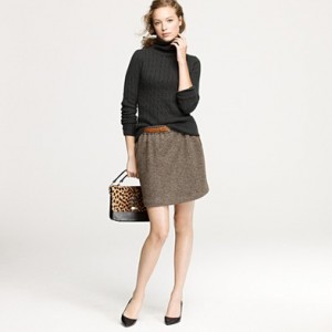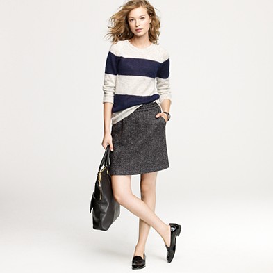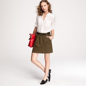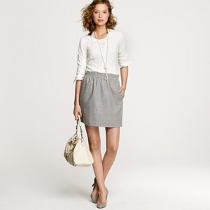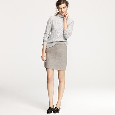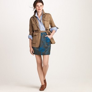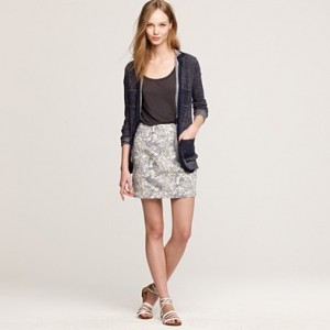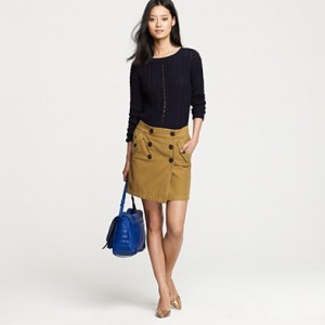 From JCrew: “From the relaunched ’60s denim label (originally called “Made in Heaven” because they made the most perfect-fitting, leg-lengthening and bum-enhancing jeans around), a curve-contouring pencil skirt every girl needs to have. Cotton denim. Sits at waist. Belt loops. Button fly. Traditional 5-pocket styling. Back vent. USA. Machine wash.”