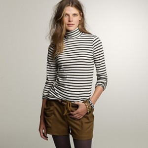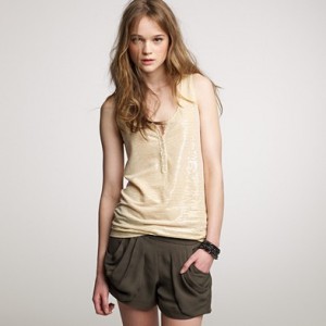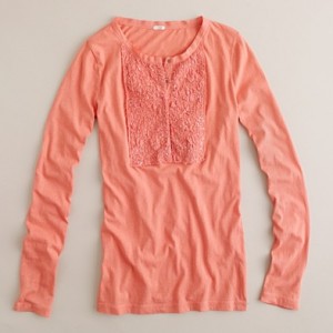 From JCrew: “A ruched woven patch with coverstitch-embroidered sequins makes this tuxedo-inspired henley feel special. Lightweight, bias-cut cotton with a very soft wash. Open crewneck (an exaggerated crewneck that’s just shy of a scoopneck), with a snap-button henley placket. Long sleeves. Import. Hand wash.”