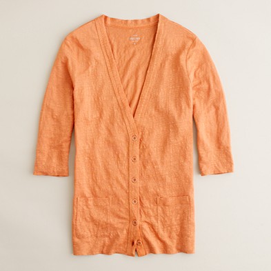 From JCrew: “The easiest, most flattering cotton cardigan you’ll own. It’s made with our super-refined baby-rib cotton and is cut a bit slimmer, so the fit is fantastic. Our designers added welt pockets and grosgrain tape along the pockets and placket for a contrast of textures. V-neck. Long sleeves. Import. Machine wash.”