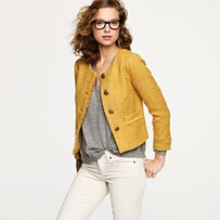From JCrew: “Our design team’s latest blazer brilliance? Knit. In cotton/wool jacquard with a brushed surface (we love its supple handfeel and speckled character), this double-breasted classic boasts a soft, drapey blazer fit that feels easy and modern. Adding to the chic factor are raw-edge seams. Lapel collar. Long sleeves. Welt pockets. Buttons at cuffs. Back vent. Partially lined. Hits at hip. Import. Dry clean.”