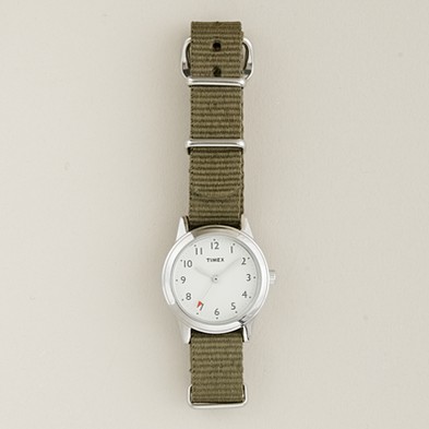 rom JCrew: “Switch out the strap and give your watch a whole new look. Compatible with our Timex® military watch, Timex vintage field army watch and Timex Andros watch. Poly. Import. 10 5/8″L x 3/4″W.”