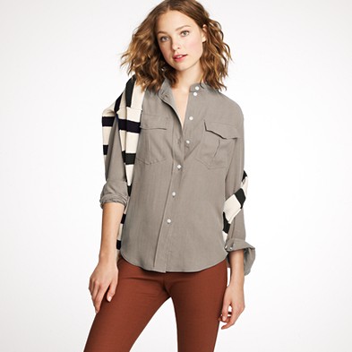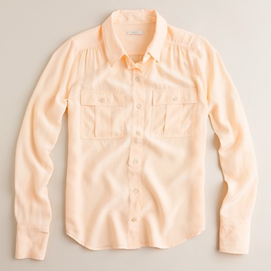 From JCrew: “Our favorite new wardrobe recruit—a classic army shirt reimagined in deliciously drapey and feminine silk crepe de chine, now in a palette of vivid paint-box hues. Dressed up or down, this flattering-on-everyone top is the ultimate in effortless chic. You’ll love our updated version with a slightly longer length (we added an additional two inches so it always stays tucked in). You asked, we listened. Button closure. Long roll-up sleeves. Buttons at cuffs. Import. Dry clean.”