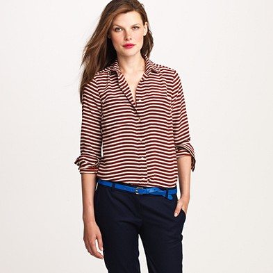 From JCrew: “The boyfriend shirt, reimagined in luxe silk crepe de chine in an of-the-moment stripe we adore. Fashioned in a classic silhouette updated with seams at the bust for a subtly feminine fit. Long sleeves. Chest patch pockets. Import. Dry clean.”