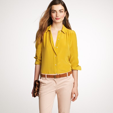 From JCrew: “So sumptuous in silk crepe de chine, it’s the perfect wear-with-all blouse—rendered in an utterly irresistible palette—that looks just as good paired with jeans as it does with a suit (think wear-to-work chic). Button closure. Long sleeves. Buttons at cuffs. Import. Dry clean.”