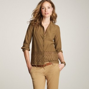 From JCrew: “Unfailingly feminine in crisp cotton, dressed in fluid eyelet waves. Featuring a delicately shirred front and back yoke and a graceful scalloped hem (we’re in love). Button closure. Long sleeves. Import. Dry clean.”