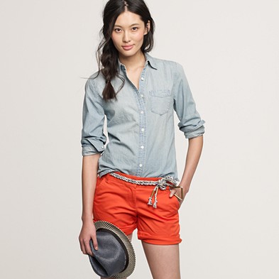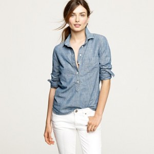 From JCrew: “A design team must (and a customer favorite), this heirloom-worthy shirt has authentic details inspired by vintage workwear from the 1930s, and the Japanese selvedge cotton chambray is the best there is (we stonewash ours for that perfect worn-in look and feel). Now refashioned in a popover body with a more feminine, flattering fit. Button closure. Long roll-up sleeves. Buttons at cuffs. Chest patch pocket. Import. Machine wash. Catalog/jcrew.com only.”