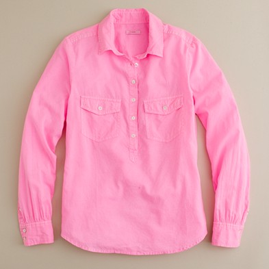 From JCrew: “Part button-down, part pullover—we love this silhouette for its extreme casual chicness. The best part? It’s garment-dyed in our favorite super-saturated brights to really amp up the color (and make the white stitching pop). Cotton oxford. Button closure. Long roll-up sleeves. Import. Machine wash.”