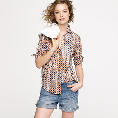 From JCrew: “Borrowed from the boys but designed and tailored impeccably for us—that’s why we call it perfect—with precise placement of waist and bust darts to create our most fitted, feminine silhouette yet. The effect? Crisp, classic and casually chic in an abstract check. Cotton. Long roll-up sleeves. Import. Machine wash. Catalog/jcrew.com only.”
