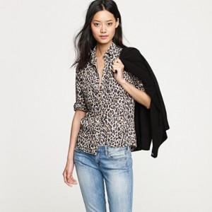 From JCrew: “Borrowed from the boys but designed and tailored impeccably for us—that’s why we call it perfect—with precise placement of waist and bust darts to create our most fitted, feminine silhouette yet. The effect? Crisp, classic and casually chic in a flirty leopard motif. Cotton. Long roll-up sleeves. Import. Machine wash.”