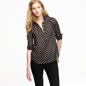 From JCrew: “With winsome allover polka dots, this popover blouse owes its fresh-air feel to a subtly sheer fabric that’s ideal for layering or wearing solo. Cotton lawn/silk. Button closure. Long roll-up sleeves. Functional buttons at cuffs. Import. Machine wash. Catalog/jcrew.com only.”