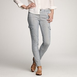 From JCrew: “Our pitch-perfect new take on the skinny pant in a microstripe twill with too-cool utility details. Crafted in sublimely soft cotton with just the right hint of stretch—it skims and smooths in all the right places—with silhouette-defining seams (all the better for a leaner, longer-looking leg), so-right-now utility pockets and ankle zips for a dose of downtown cool. Belt loops. Zip fly. Patch pockets, back flap pockets with snap closure. Import. Machine wash.