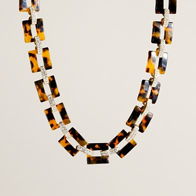 From JCrew: “A classic look inspired by ’30s-era glam (think pavé-set rhinestones) made modern with a pop of color. Resin links with light gold ox-plated tin castings on plated brass links pavé set with faceted Czech glass stones. Foldover clasp closure. Import. Length: 20″.”