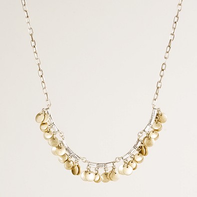 From JCrew: “A playful update to the classic crystal necklace: Our designer added bohemian flair and movement with dozens of shaky metal discs paired with triplets of shiny crystal baguettes hand set in curved zinc castings. The result is a completely wearable midlength necklace that’s become our new everyday essential. Glass stones hand set in light gold ox-plated (antique gold) or dark silver ox-plated (antique silver) zinc castings with a brass chain. Signature spring clasp closure. Import. Length: 20″ with 3″ extender chain for adjustable length.”