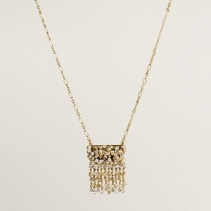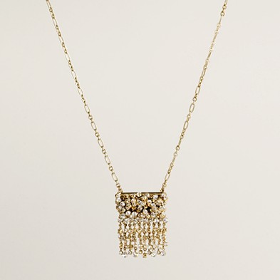 From JCrew: “This sweet crystal sparkler takes a cue from the swingy beaded dresses of the Roaring Twenties. A cluster of faceted glass crystals gives way to a drizzle of delicate crystal fringe. Glass crystals hand set in light gold ox-plated brass settings attached to a plated brass casting with brass chains. Signature spring clasp closure. Import. Length: 28″ with a 3″ extender chain for adjustable length.”