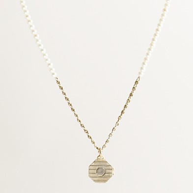 From JCrew: “This season our designer was inspired by personal and heirloom jewelry (think vintage pendants, ID bracelets and nameplate necklaces) and this pretty piece is no exception. A hand-strung strand of glass pearls gives way to a brass chain (with sweet wrapped-link detailing) and an octagonal locket that’s been stamped with a pretty stripe pattern. Hand-strung glass pearls linked to a hand-assembled dark worn antiqued gold-plated brass chain with a plated brass locket. Signature spring clasp closure. Import. Length: 28″ with a 3″ extender chain for adjustable length.”